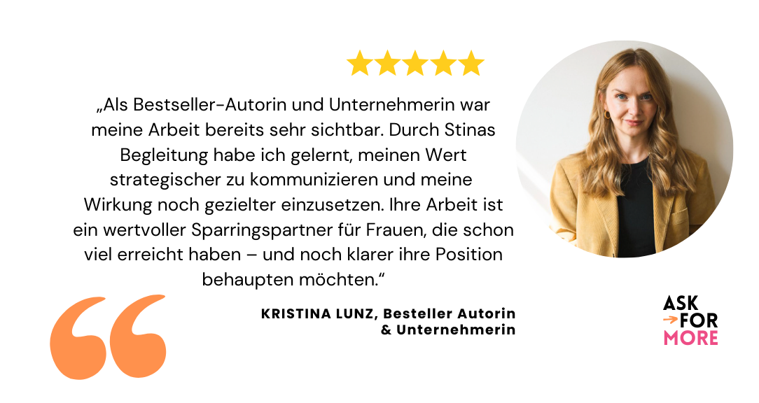„Stina hat mir gezeigt, dass für mich alles möglich ist – wenn ich meine Expertise aus meinem persönlichen Blickwinkel in die Welt bringe. Der Mut hat sich ausgezahlt. Und heute passiert, was ich nie für möglich gehalten hätte: Ich schreibe mein eigenes Buch!“